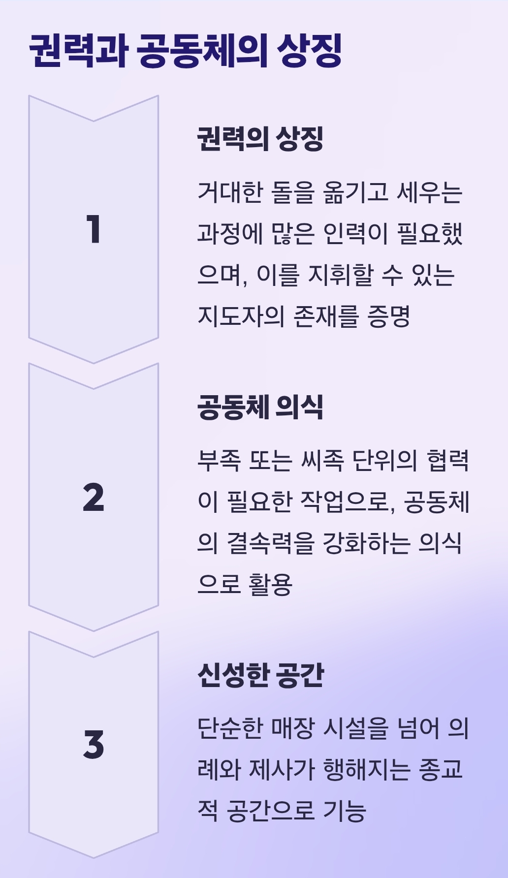- 일반적으로는 지배계층 또는 공동체 지도자의 무덤으로 여겨지지만, 일부는 제단이나 기념물로 사용되었을 가능성도 있습니다.